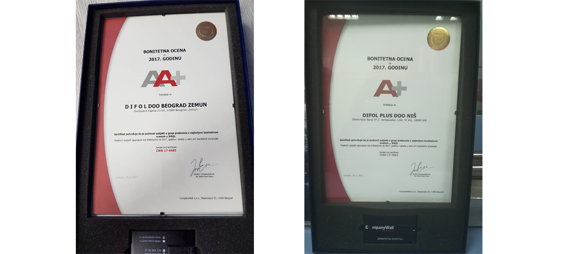 Sa ponosom ističemo da je Kompanija Difol dobila najvišu Bonitetnu ocenu za uspešno poslovanje u 2017. godini, od strane CompanyWall business tima. Zahvaljujemo timu na oceni koja ukazuje na prepoznavanje uloženog truda i rada, te kvaliteta, takođe zahvaljujemo i našim klijentima na odličnoj saradnji i ukazanom poverenju. Trudićemo se i dalje da opravdamo vaše poverenje i postignuti uspeh pružanjem maksimalne podrške klijentima.